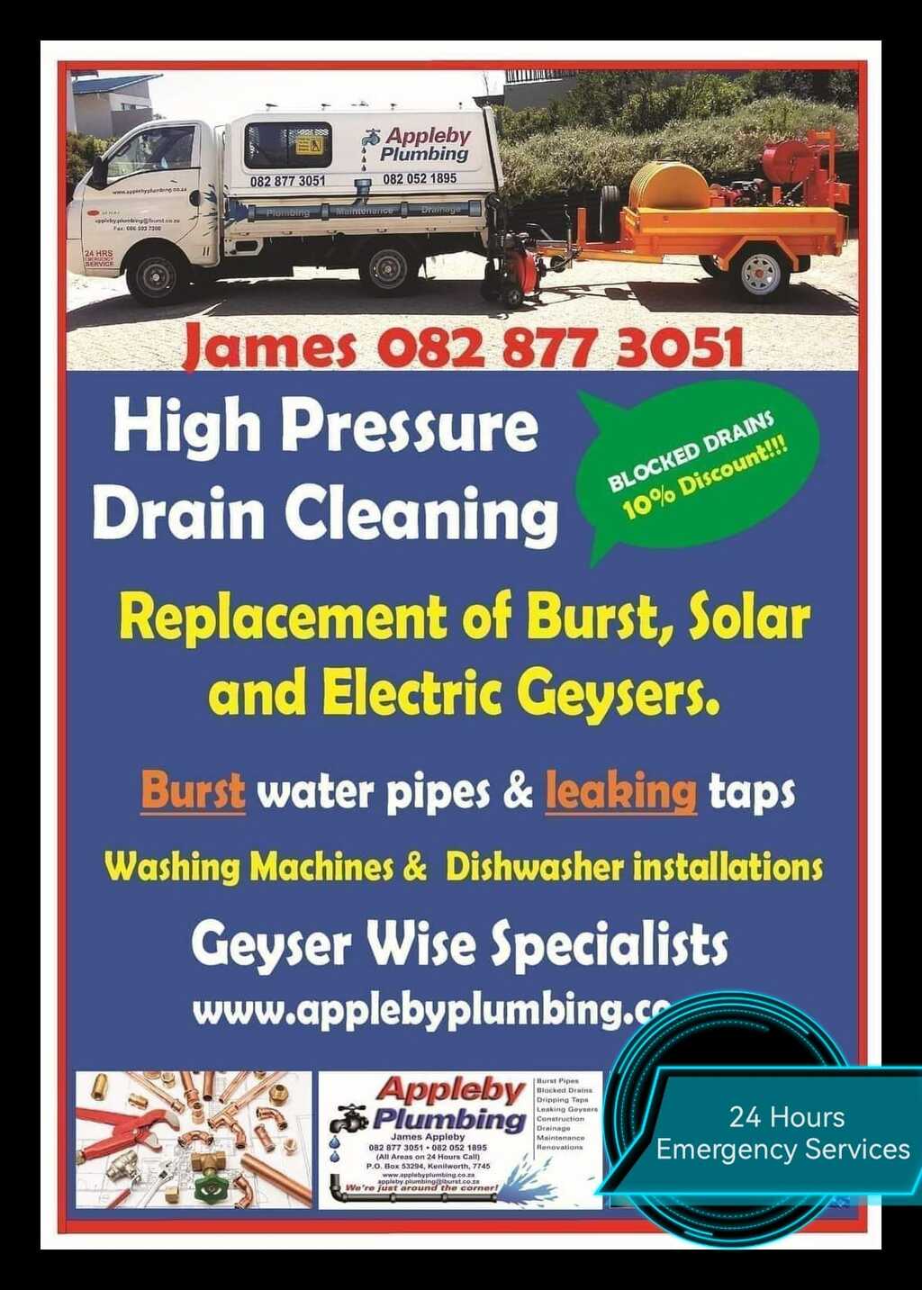 Appleby Plumbing & Latest Specialist Drain Cleaning Services runs a Professional Emergency Service throughout the Peninsula-Wide, Atlantic Seaboard, Southern Suburbs, Southern Peninsula, Northern Suburbs, Cape Town CBD, Cape Winelands, Helderberg, Gordons Bay, Overberg, West Coast Municipalities areas & Western Cape. We work throughout South Africa for Plumbing & Electrical Maintenance Services, including a 24-Hour Emergency service.